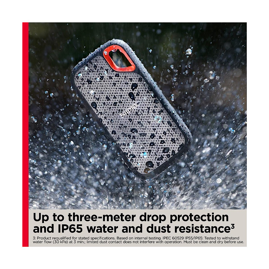 این حافظه SSD اکسترنال مقاومت بالایی برای حمل و نقل و استفاده در شرایط آب و هوایی گوناگون دارد. به لطف گواهی IP55، این محصول در برابر نفوذ آب و گرد و غبار مقاوم است. به علاوه، بدنه آن به گونهای طراحی شده که در برابر سقوط از ارتفاع ۲ متری نیز دوام بیاورد. برای حفظ امنیت اطلاعات شما نیز، میتوان از رمزنگاری سختافزاری 256-bit AES استفاده کرد.